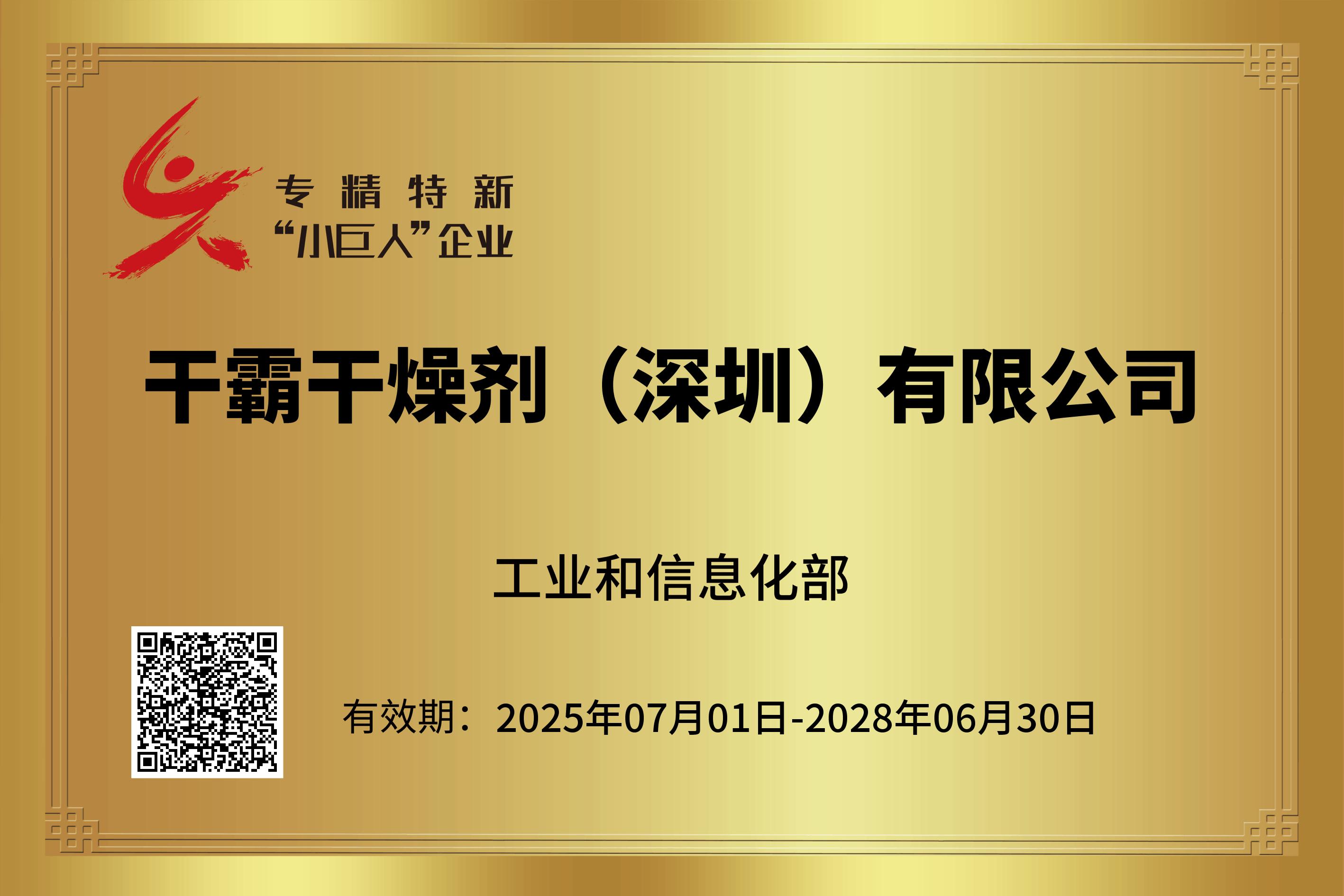 10月20日,工业和信息化部重磅揭晓第七批国家级专精特新“小巨人”企业认定名单。干霸干燥剂(深圳)有限公司凭借深厚的技术积累、持续的创新能力与领先的市场地位,成功入选,成为干燥剂行业首家获此国家级认定的企业!